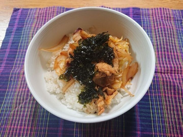 たれ付きの豚肉(お正月につい買ってしまったもの)と野菜を炒めて丼にしました。