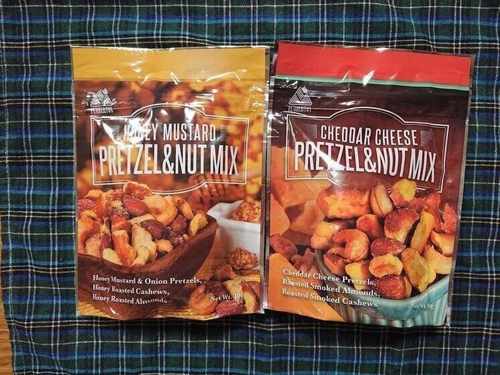 こちらは濃厚チェダーチーズプレッツェルと、程よい塩気が後を引くスモーキーにローストしたアーモンドとカシューナッツのスナックです。