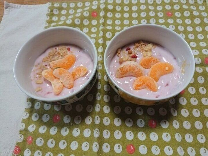 おやつは既製品が多いです。(この日はフルーチェに業務スーパーの冷凍ミカンを入れました。冷凍ミカンはすぐに食べられるのですごく便利です。)