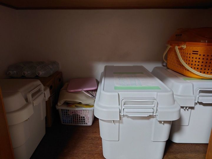 他には、左奥に水を2ケース+3本、左手前には除菌スプレーなど日用品が入っています。