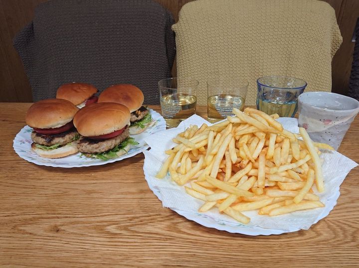 この日買ったバンズ、ハンバーガー、ポテト、ジュースを使ってハンバーガーセットを作りました。