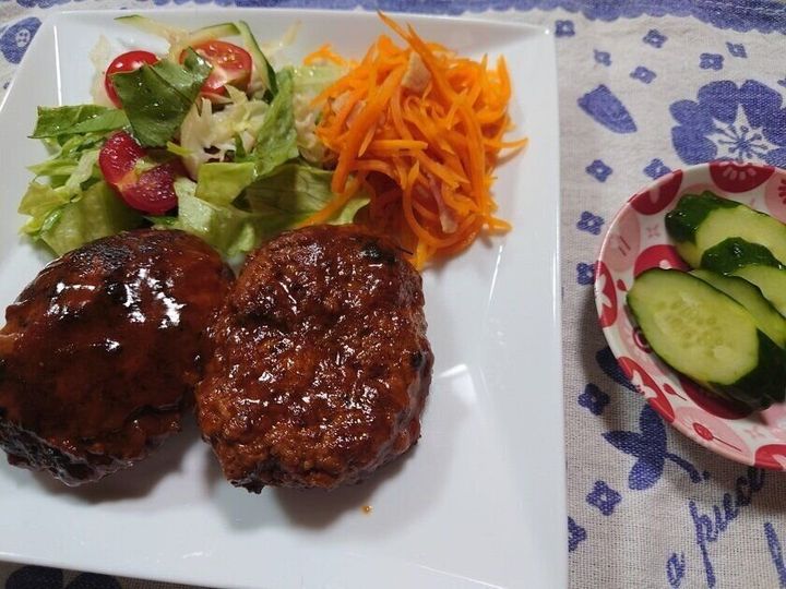 ハンバーグは一人3個(バイト帰りの息子は4個)食べました(私は作っている間にお腹がいっぱいになってしまい、1個で十分でした)