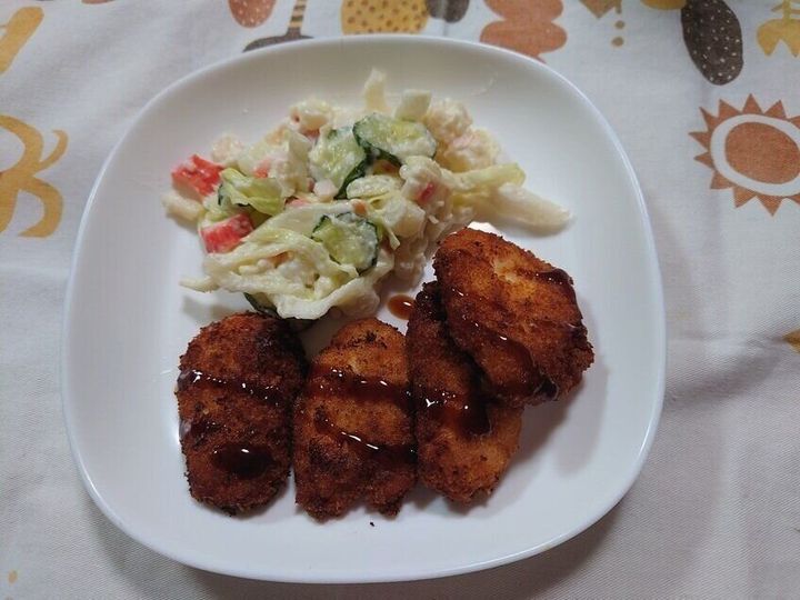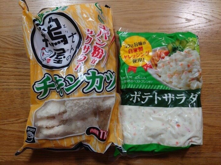 冷凍のチキンカツとポテトサラダを使ってとても簡単な夕飯にしました。