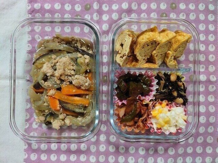 大学生のバイト弁当です。大学生のリクエスト通りに作りました(お菓子は娘の修学旅行のお土産です)