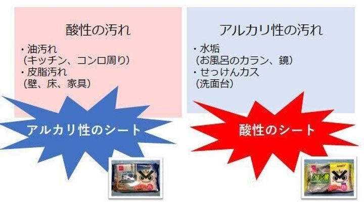 ですから、酸性の汚れには重曹シート、アルカリ性の汚れにはクエン酸シートが有効というわけです。