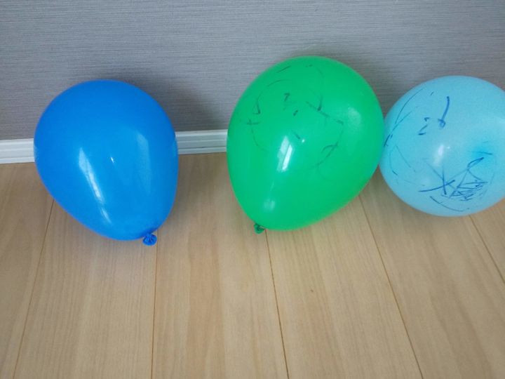 油性ペンで、好きなキャラクターなどを書いて、自分だけのオリジナル風船ができあがり、二人とも気に入っていますよ。