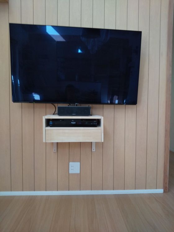 テレビの買い替えをきっかけにテレビ台を処分し、壁掛けにしました。ブルーレイレコーダーの台は夫の手作りです!