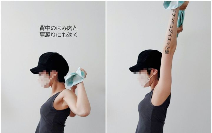 肩幅より少し広めにタオルを持った手を後頭部側へ。