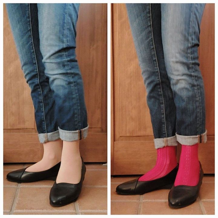 シンプルな服装の時にほど、靴下の色で遊ぶとあか抜けて見えますよ。