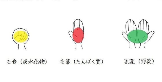 ご飯は握りこぶしくらい、お肉は片手分(指は含まず)、野菜は両手分(お肉の倍)