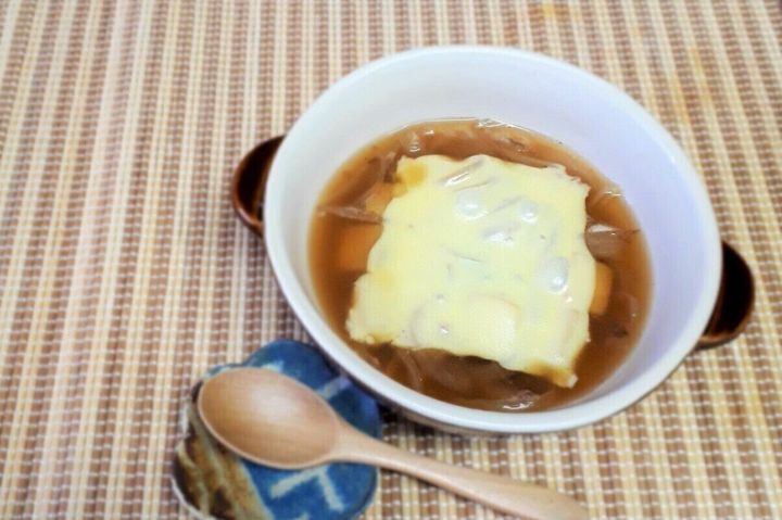 3・耐熱容器に、水気を絞ってひと口大にした高野豆腐を入れ、2を注ぎ、とろけるチーズをのせて電子レンジで2分ほど。