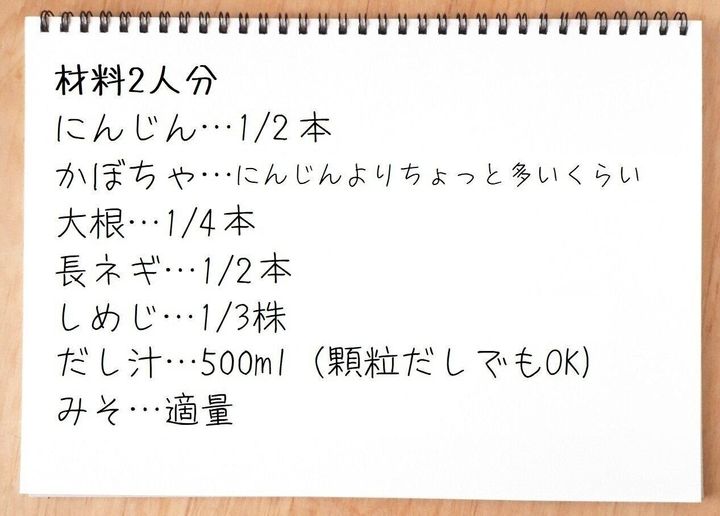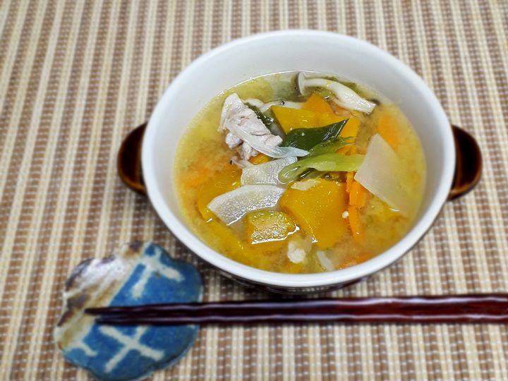 かぼちゃとニンジン、大根、長ネギ、しめじ。秋冬が旬の野菜たっぷりのおみそ汁です。