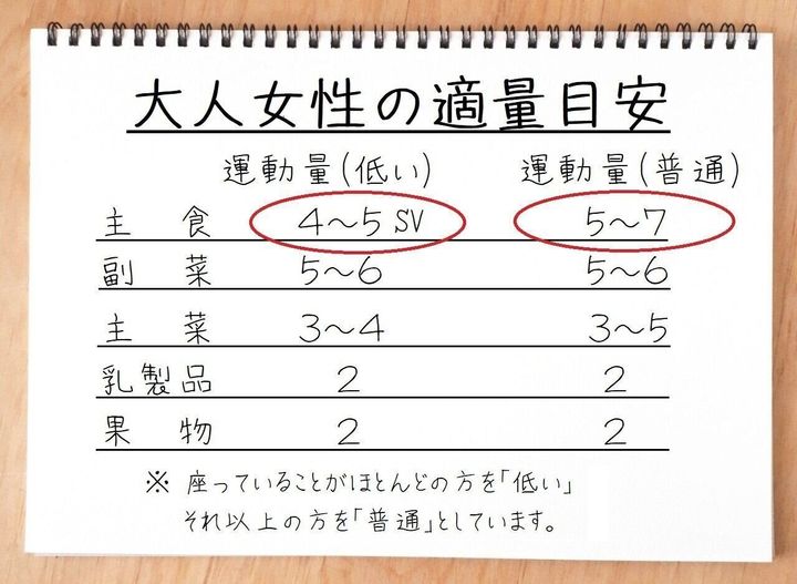 でも、意外なことに、必要な副菜(野菜)と主菜(たんぱく質)の量はあまり変わらないのです。加減するのは、主食(炭水化物)です。