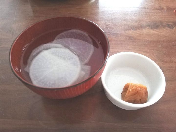 朝は回復食として、「スッキリ大根」を食べました。1Lの水で大根1/3本を昆布だしで煮て、梅干しといっしょに食べるというもの。