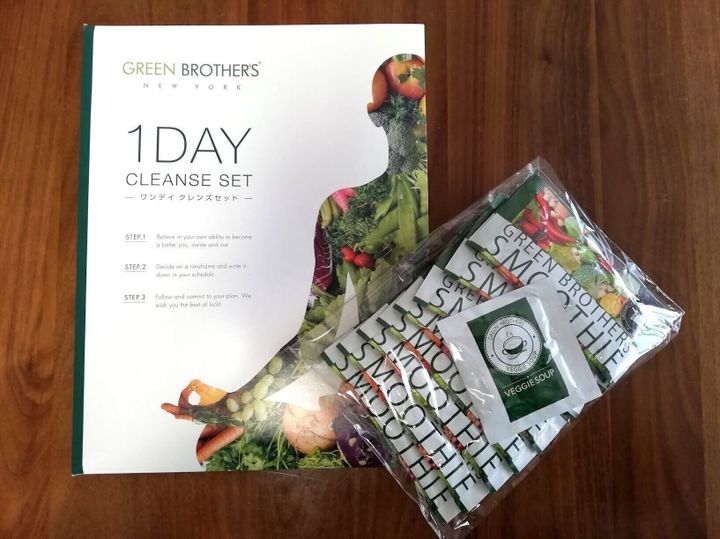 グリーンブラザーズの「1DAY CLEANSE SET」を購入し、同封されている酵素スムージーとおかゆ・粉末スープを使用しました。