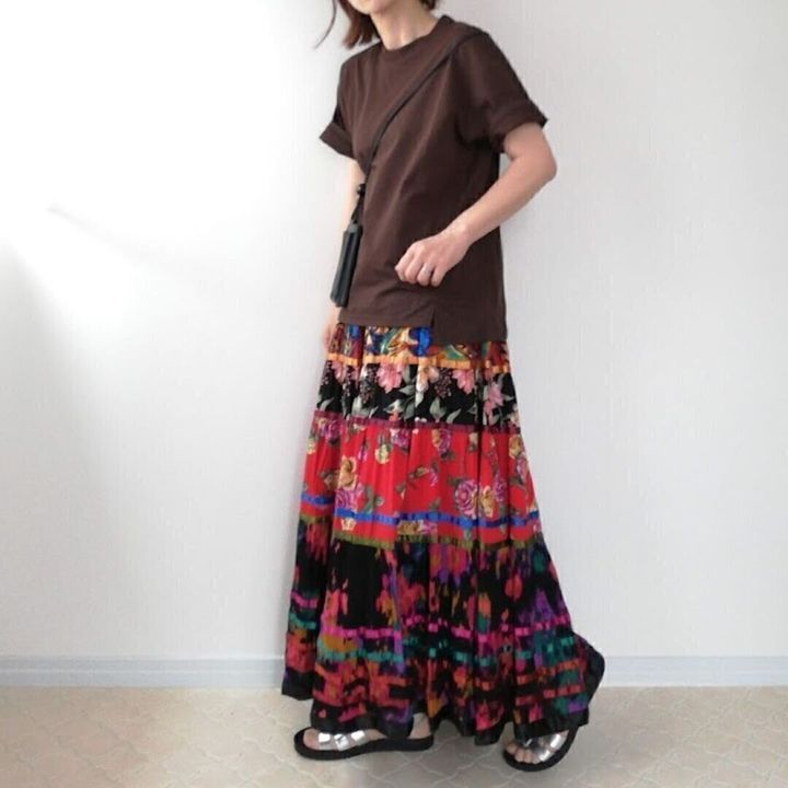 華やかな柄ロングスカートで、シンプルなTシャツコーデを格上げ!