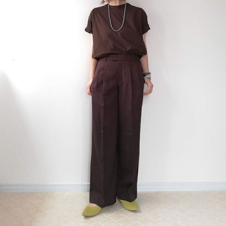 ボトムスを同じブラウンで統一することで、セットアップのような雰囲気に。
