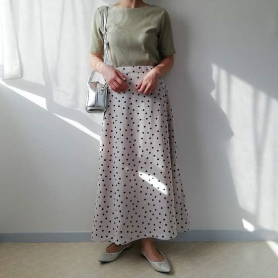 トップスをインしてウエストマークし、足もとに向かって広がるロングスカートで「Xライン」を作ったコーデ。