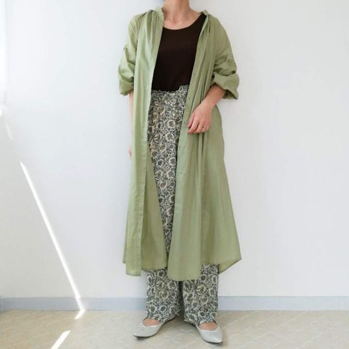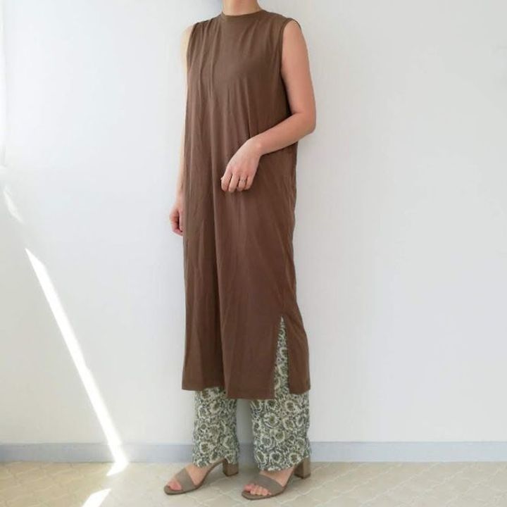 ノースリーブ×パンツにシャツワンピースをはおって。