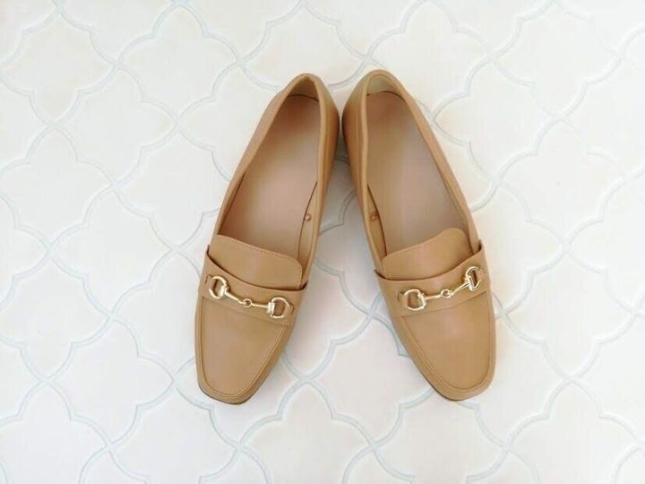 ベーシックな黒のローファーと比べると、ベージュのビットローファーは