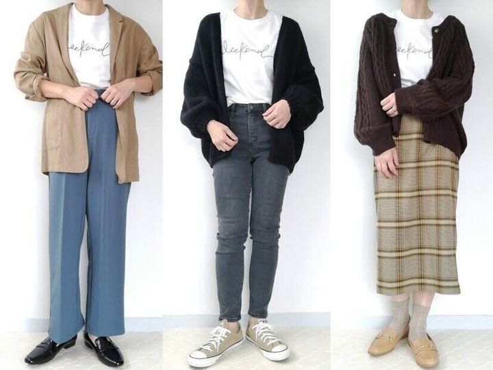 カーディガンやライトアウターが活躍する秋冬こそ、インナーとして「ロゴT」が効くんです。