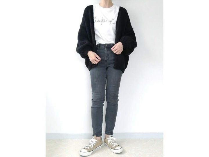 スキニーデニム×ロゴTに黒カーディガンを羽織って。