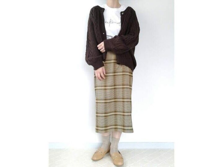 落ち着いたチェック柄タイトスカートで、大人らしさをプラス。
