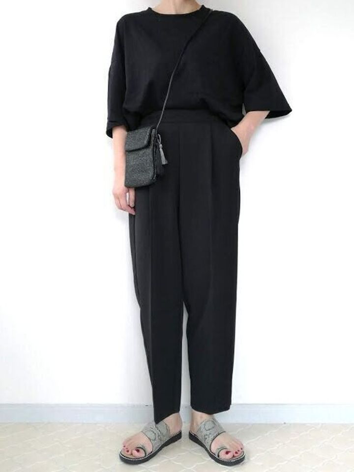 Tシャツ×テーパードパンツのオールブラックコーデにON。