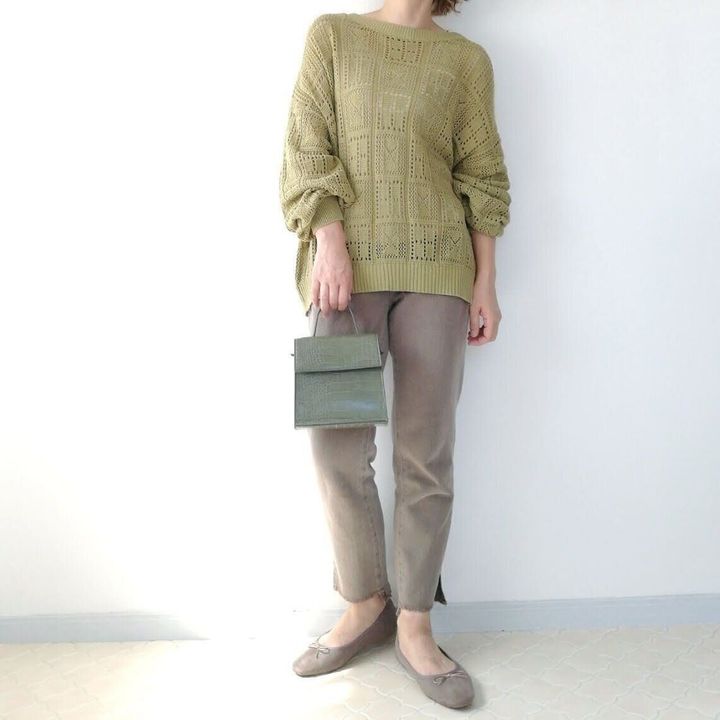 春夏から人気の透かし編みと、トレンドライクなグリーンカラーで旬な着こなしを叶えてくれそう!