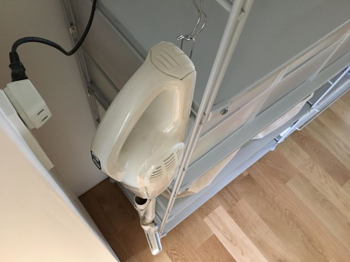 S字フックに吊り下げているので、出し入れ簡単。すぐ横にプラグの差込口があるため、収納したまま充電ができる点も気に入っています。
