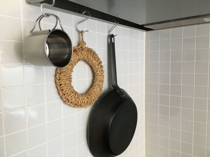 横にはいつも使う鍋敷きとフライパンも一緒に吊り下げています。