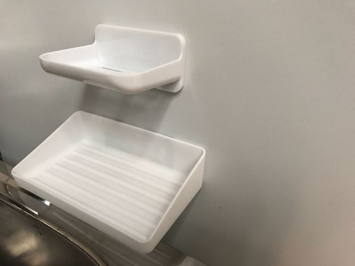 写真は台所のシンク横の冷蔵庫に取り付けたスポンジ&石けん置き場。上段が石けん、下段がスポンジ用です。上段の石けん置きには穴が開いているので、水も溜まらず衛生的。石けんに付いた少量の水分は下段のスポンジ置き場に置いたスポンジで受け止めるという発想の為、下段には穴の開いていないものを。