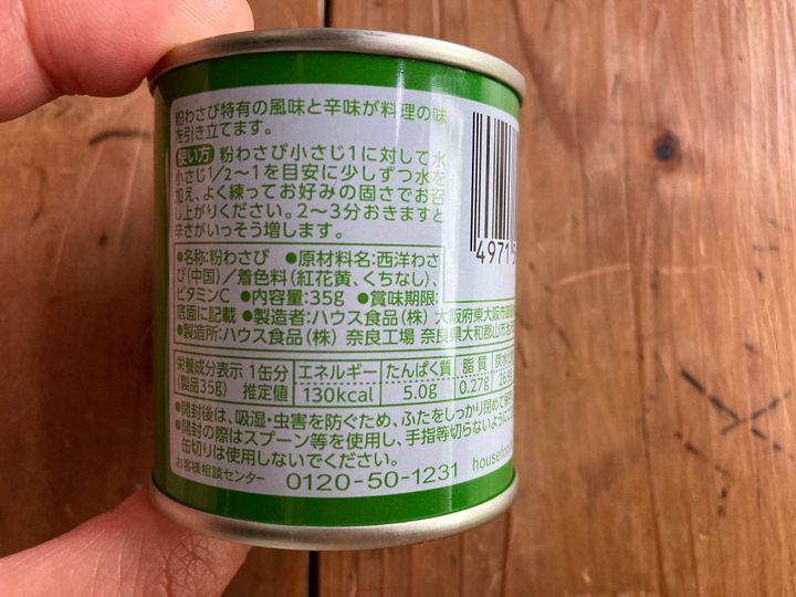 使うたびに缶から使う分量の粉を取り出し、少量の水で練って使うので、開封後の賞味期限にびくびくしなくて良いのはもちろん。何より添加物が少ない。私が購入したハウス食品(株)のものは、原材料名の欄に「西洋わさび(中国)/着色料(紅花黄、くちなし)、ビタミンC」のみです。チューブタイプのものは添加物が多くて買うのをためらっていた私にはうってつけの粉ワサビ!*私が購入した粉ワサビは缶底に賞味期限があり2022.12.27でした。