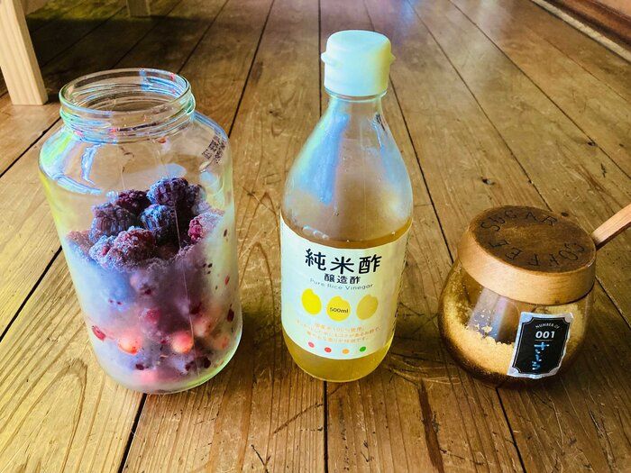 私が好んでこの1ヶ月飲んでいるのが、自家製柿酢のブラックベリーお酢ドリンク。牛乳割りがたまらなく美味しくて、毎日350mlほど飲んでいます。