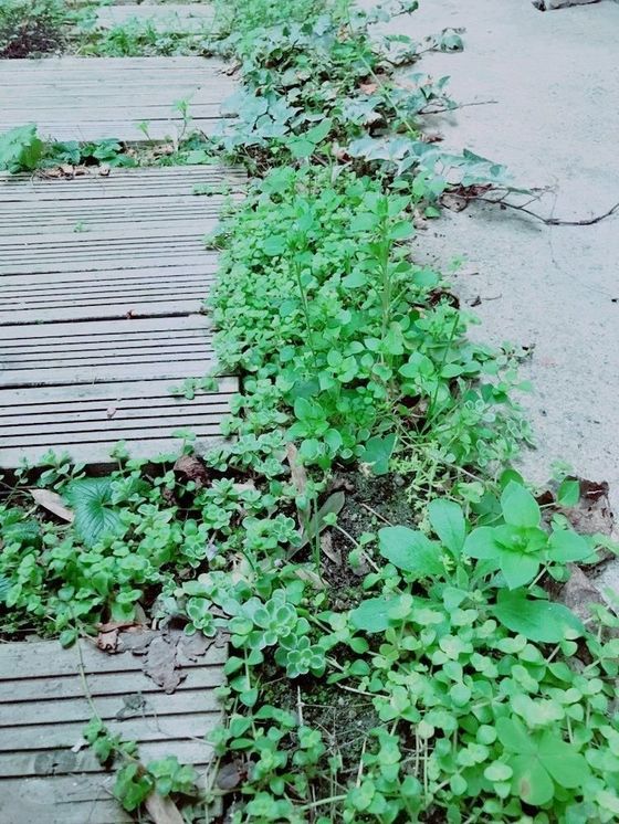 この中で私が意図的に植えたのは、セダム、ワイルドストロベリー、アイビー、グレコマなど。そして、その合間をぬうように生えだしたのが、ハコベ、ムラサキサギゴケ、クローバーなど。それらが調和を保って自然な美しさを刻んでいます。