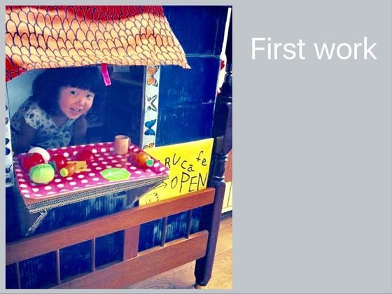 2段ベッドの下段に壁と窓を作り、マルシェの移動カフェ風にしてみました。