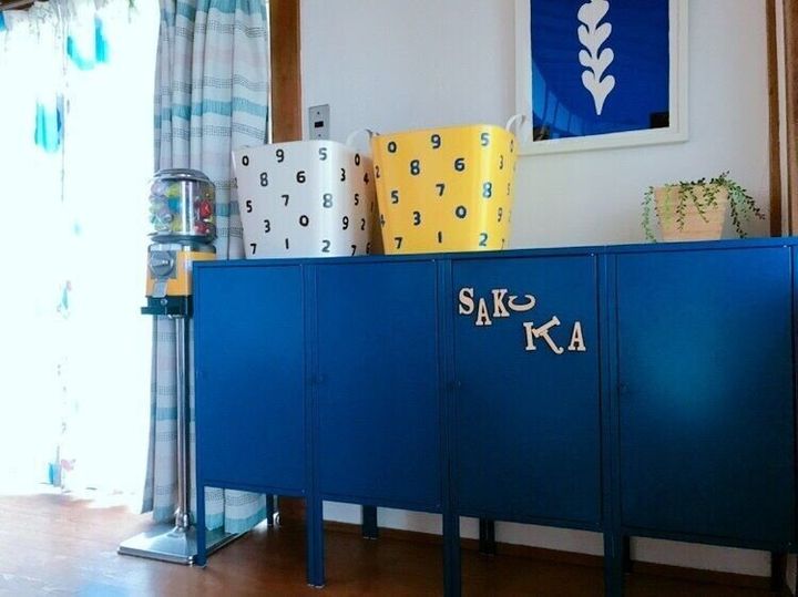 まず、我が家のちょっとした棚その1が、この青いロッカー。ここの1割のディスプレイがフェイクグリーンです。棚の上のカゴ2つは、実用性バリバリ、ランドセルなど「次の日の学校セット入れ」です。
