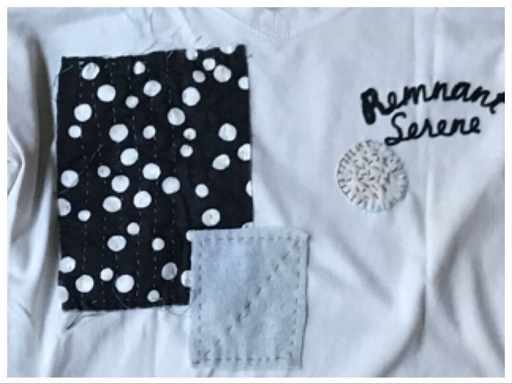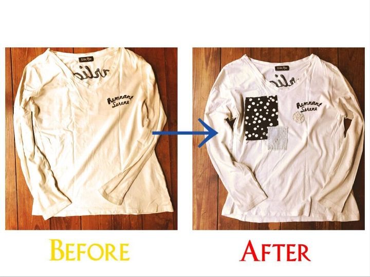 繕い方といっても、いたってカンタン。写真は油汚れの飛び散ったカットソーなのですが、汚れのある場所にハギレを置き、場所が決まったらまち針で押さえて縫うだけです。ポイントはハギレを置いてみた時にバランスを取ること。1枚の布で隠すよりも何枚か使う方がデザインっぽく仕上がります。バランスを見た時に、汚れのないところにプラスで布を繕うのもアリです。自由に、楽しんで布の配置を決めてよしです。