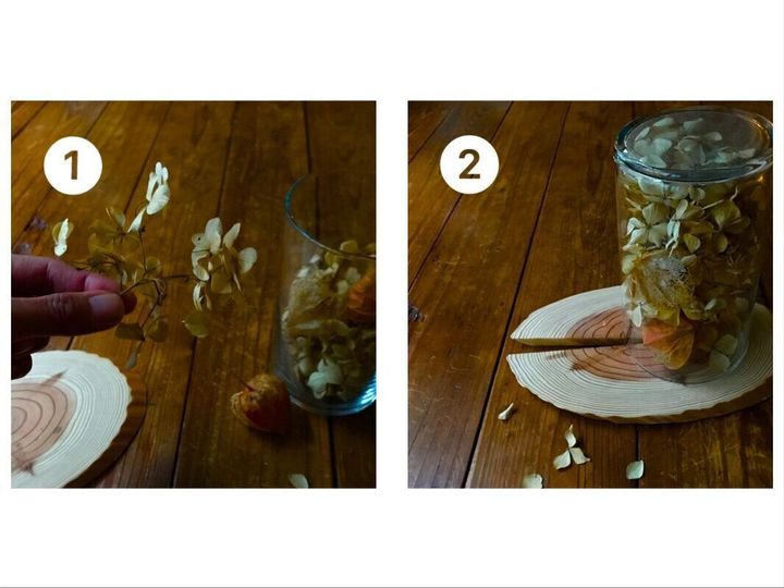 作り方と言うほどでもありませんが、ガラス瓶にドライフラワーを入れて蓋をする、もしくは逆さに向ける。以上!コースターがあれば合わせてみても良いかと思います。木製のミニまな板などを合わせてもナチュラルで良いと思います。