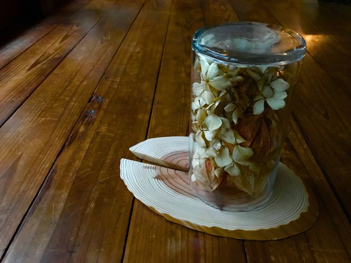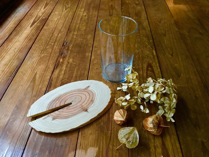 ガラス製で中にモノを入れられる瓶やフラワーベース・ドライフラワー・コースター(あれば)