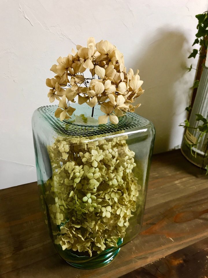 この保存瓶、実はフタがテカテカの緑色で昭和感が否めないのですが、フタを外してドライフラワーを入れ、逆さにするだけでこんなにオシャレなディスプレイに。古道具もぜひ取り入れてみてはいかがでしょうか。