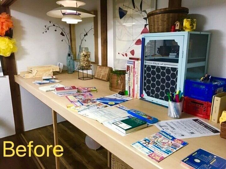 危険なまでにとっ散らかったダイニング脇の棚の上。カオス。。。これを、収納場所のあるモノは納めて、残るモノをクレッメマッカに入れたものがAfter写真。気持ち良いくらいにスッキリです。