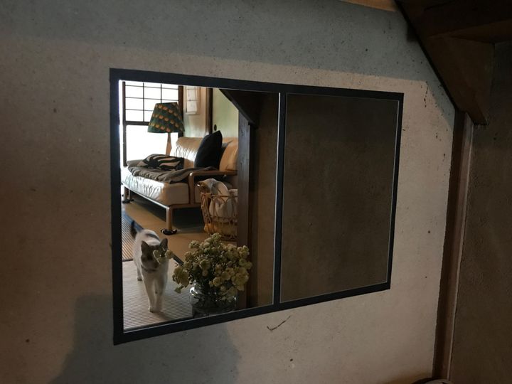 窓枠の中に鏡を貼る。貼り直しはできないので歪まないよう注意しながら慎重に。まずまず綺麗に貼れました。猫(森さん)が見にきました。