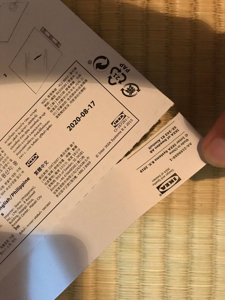 配置を最終決定。ミラーの梱包材にミシン目が入っていたのでこれをカットしミラーサイズに。カットしたものを使い、壁にセロテープで貼り、配置を最終決定。何タイプか配置方法を試しては写真を撮り、一番しっくりきたモノを選ぶ。写真を横並びにすると選びやすい。赤い丸印の配置に決定。