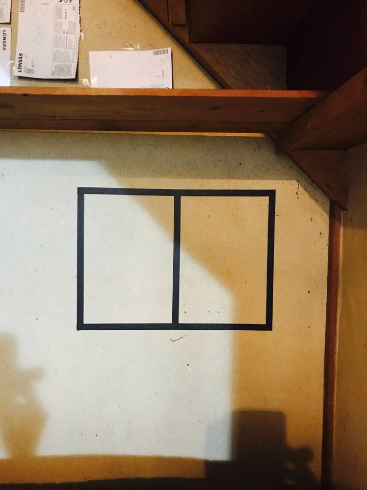 マスキングテープをデコマドの枠になるように壁に貼る。貼り終わったら少し離れたところから歪みがないかチェック。