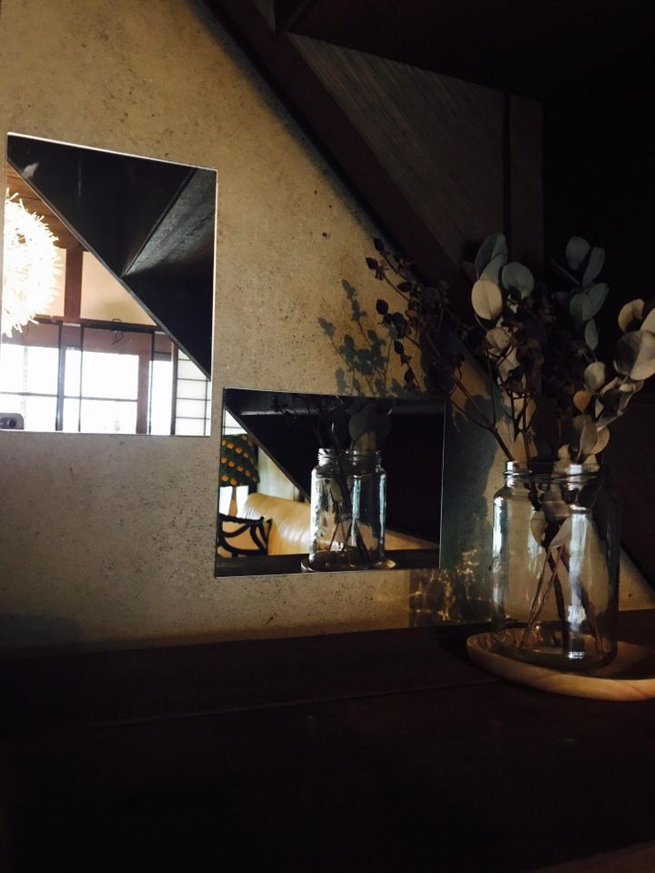 上段はランダム貼りに、下段は『デコマド風鏡』に。狭い空間に鏡を貼ると奥行きがうまれ広く感じます。鏡前に花やライトを飾るのがオススメです。
