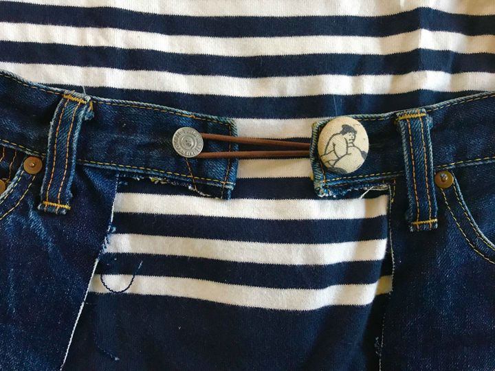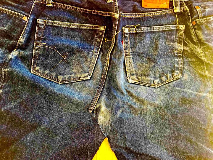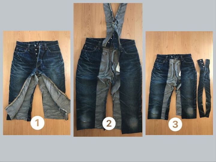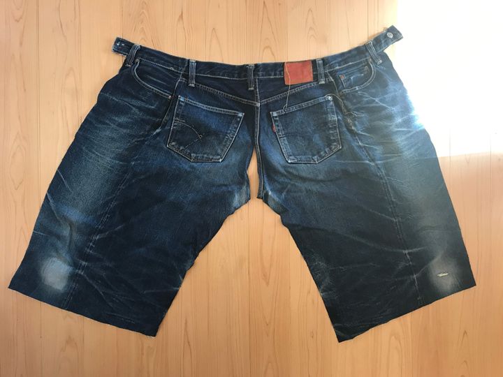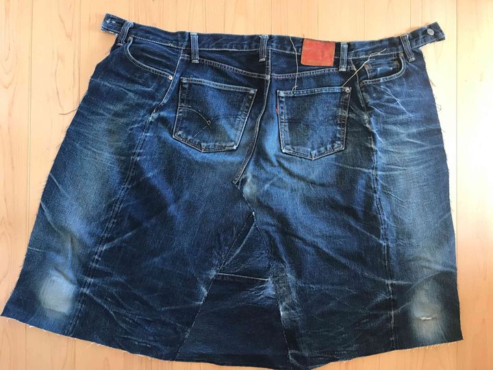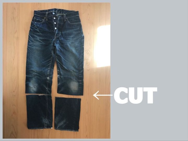 ザクっとカットして繋げるだけ。縫い目をひとつひとつリッパーで解いたりしません!本当にザクザクっとパーツを切り出します。しかもデニム地なので切りっぱなしでもオシャレに仕上がる。三つ折りもしなくてオッケイなんです。