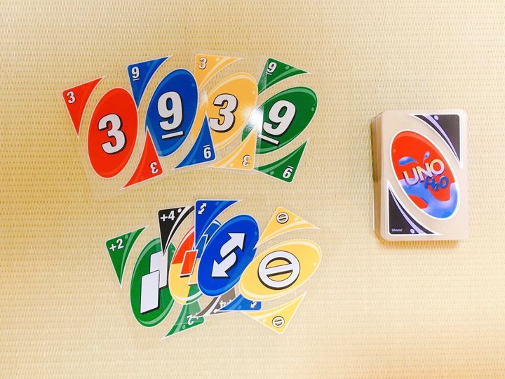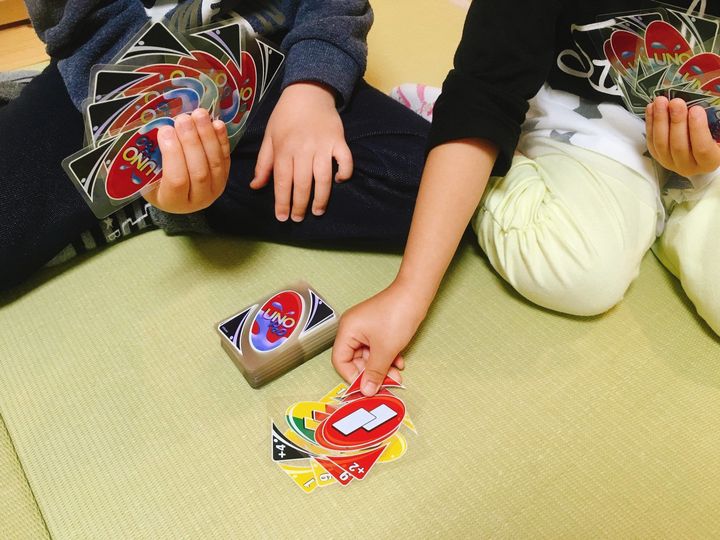 言わずと知れたカードゲーム「UNO」。プレイヤーは中央に置かれたカードと同じ色か数字のカードを順番に出していき、手持ちのカードがなくなったら勝ちというルール。残り1枚になったら「ウノ!」って言わないといけないんですよね。