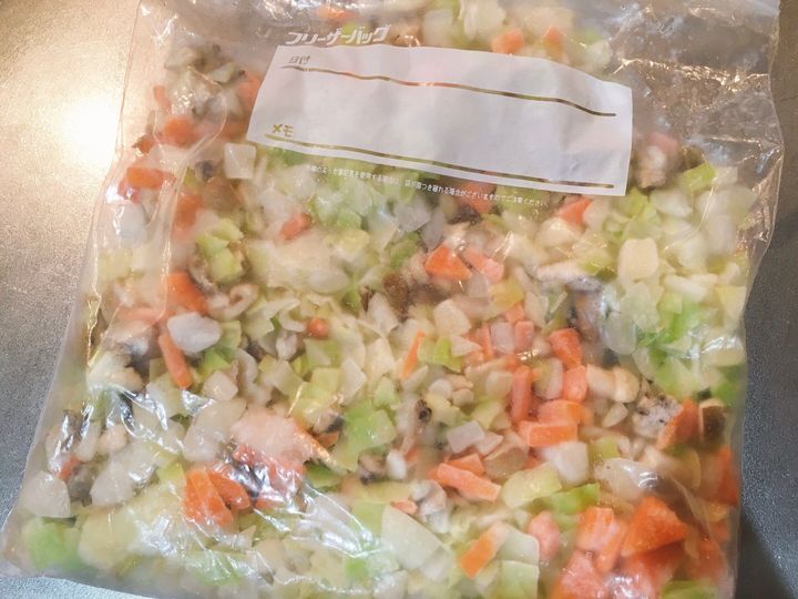 スープの良いところはベースの具を冷凍しておけること。同じ具でも味が違えば、飽きることもありません。しばらくの間は細かく切った大量の野菜をジッパー付保存袋に入れ、冷凍庫に入れておきました。