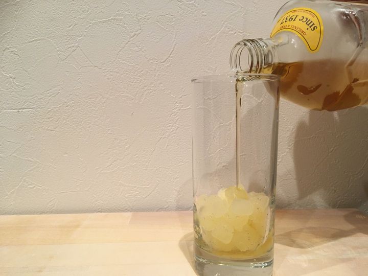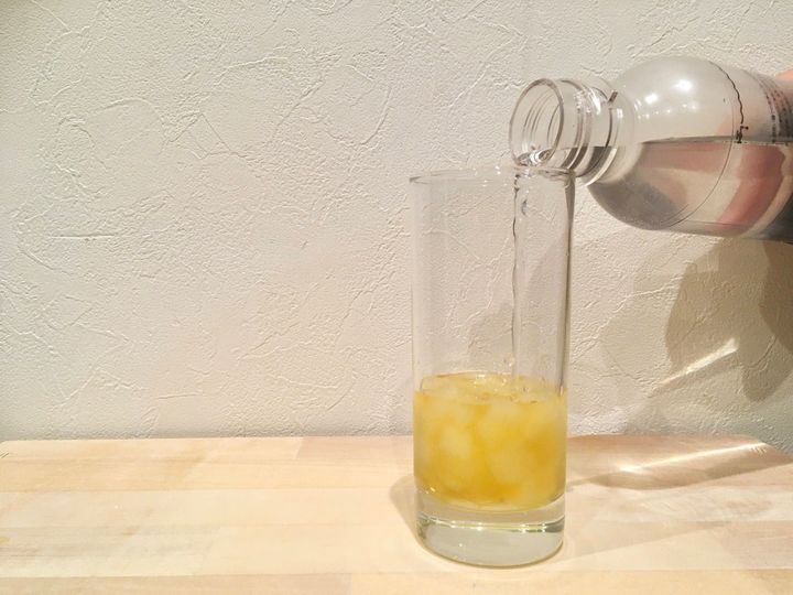 アイスボックスのグレープフルーツ味とウイスキーの相性は抜群!氷代わりに使ったアイスボックスが上に浮くので、飲むときにふんわりと香るのも嬉しい。アイスボックスが口に入った時にシャリシャリとした食感が楽しめるのもこのハイボールならではです。